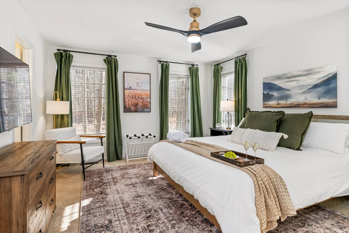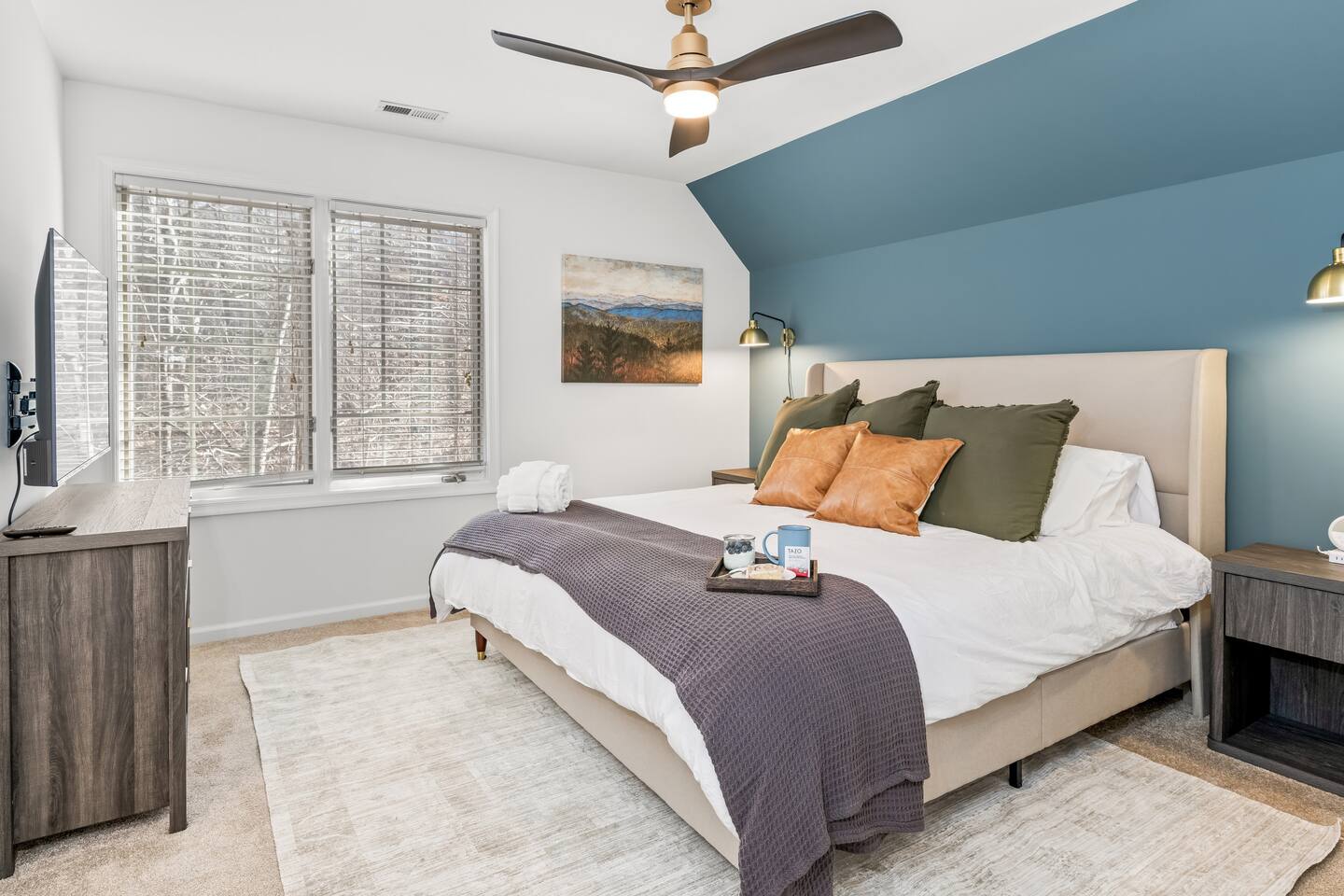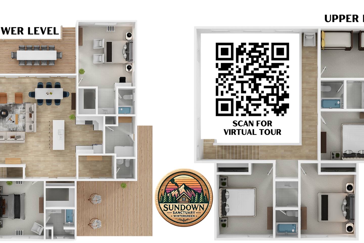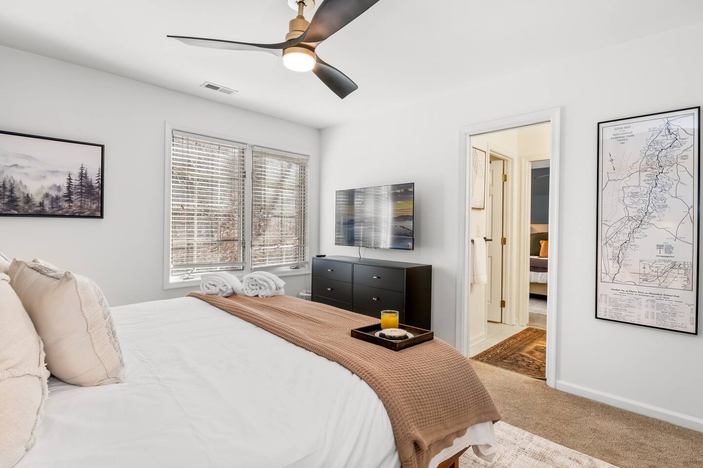 • Sundown Sanctuary is pet friendly! There is a $100 total pet fee for your visit, which will cover up to 4 pets (please indicate how many pets you are bringing in the "guests" section). • Baby gear provided: playpen, stroller, high chair, monitor, potty seat, and plenty of plate sets and cups • Wintergreen offers hiking, skiing, snowboarding, tubing, swimming, dining, spa, ropes course, golfing, and SO much more. • While there are 3 steps required to access the property, once inside, the main level has two master bedrooms, plus the kitchen, living / dining area, and back porch. • Ample parking for 6+ vehicles is available in the flat, paved driveway. • Wifi is fast with a strong signal throughout the house and deck. Each bedroom (aside from bunk room), great room, and even backyard features a smart TV where you can access all the main streaming services! • We provide a fully stocked coffee/tea/hot cocoa bar with multiple coffee drip and Keurig options. • Linens and towels are provided along with robes in the 2 master's downstairs. • Guests can enjoy free community pool access in the summer season (though the HOA rules stipulate no more than 6 guests at a time, and the permitted hours are 2-6pm). • Pack n play, high chair, baby monitor, stroller, baby gate, and kid dishes / utensils provided. • We do require a separate rental agreement, which we will send a link to e-sign after you book. There are no additional fees beyond those listed here. • Please note that if you would like to send packages to the property, you do so at your own risk. USPS does not deliver on the mountain. We cannot be held responsible for late or undelivered packages. Additionally, we charge $25 for any return services requested, in addition to actual postage.