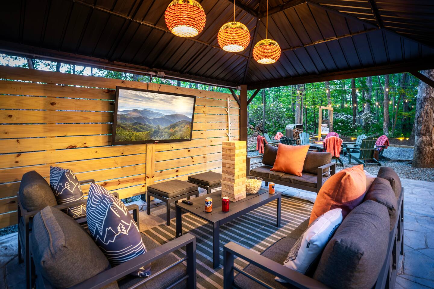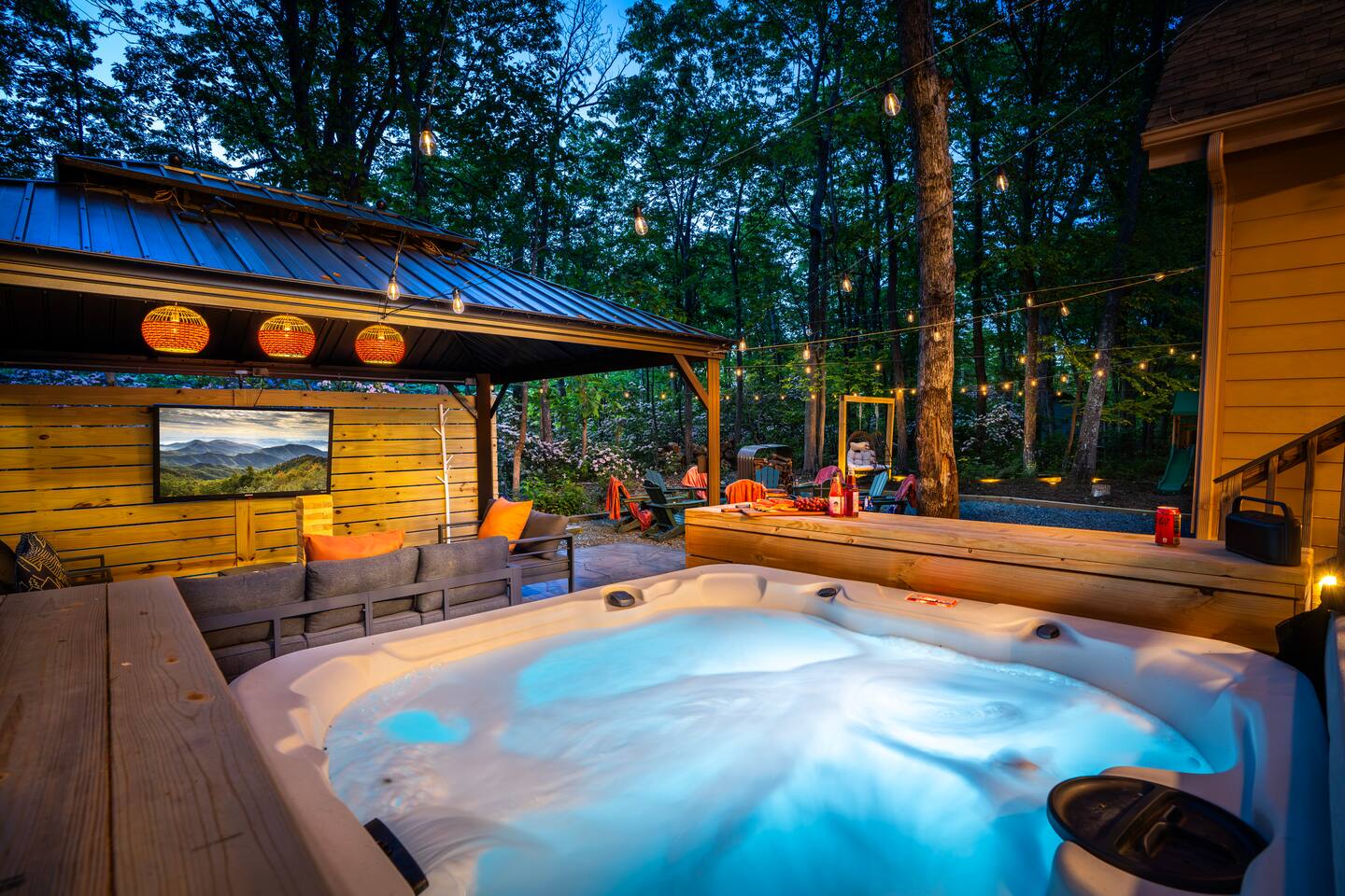 "Photos don’t do this home justice, it's absolutely beautiful & so family friendly!" Anya Welcome to Sundown Sanctuary! A stunning 6-BR home for up to 14. Imagine soaking in the hot tub w/ custom bar, telling stories around the glowing fire pit, & savoring meals in the inviting outdoor dining area. Kids will love the playground & yard games while you relax & recharge. Inside you'll find modern finishes & thoughtful touches that add a perfect backdrop for lasting memories. Plus, pet friendly!