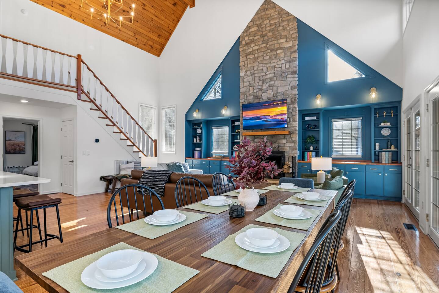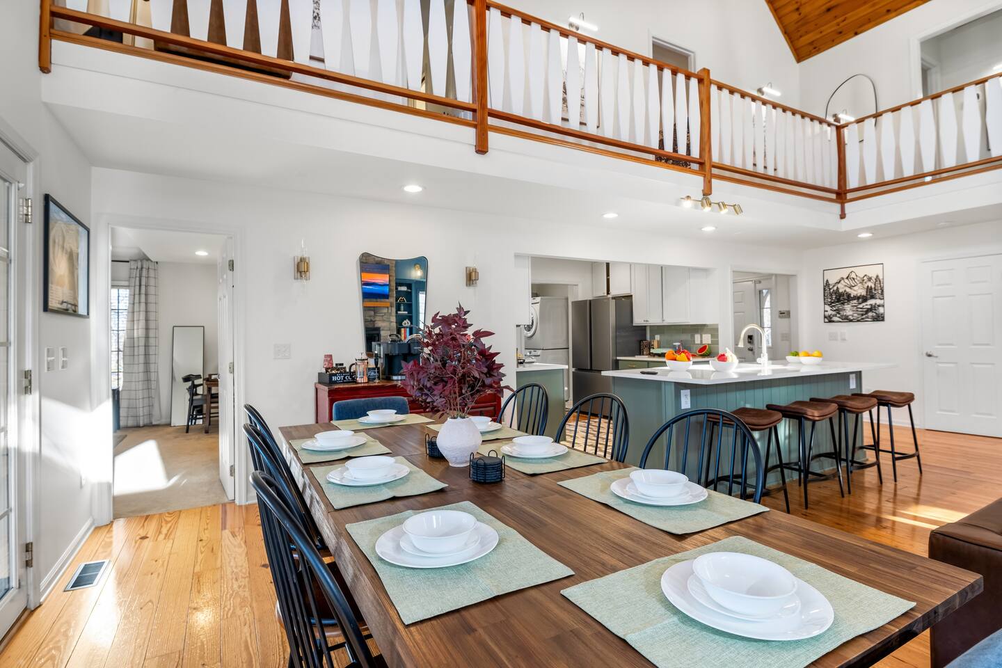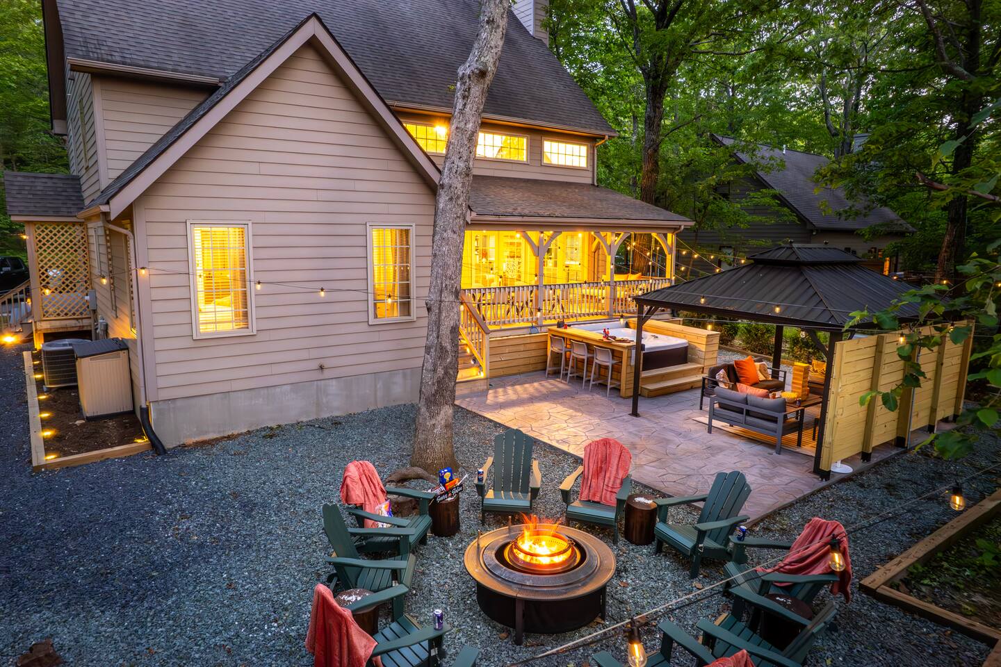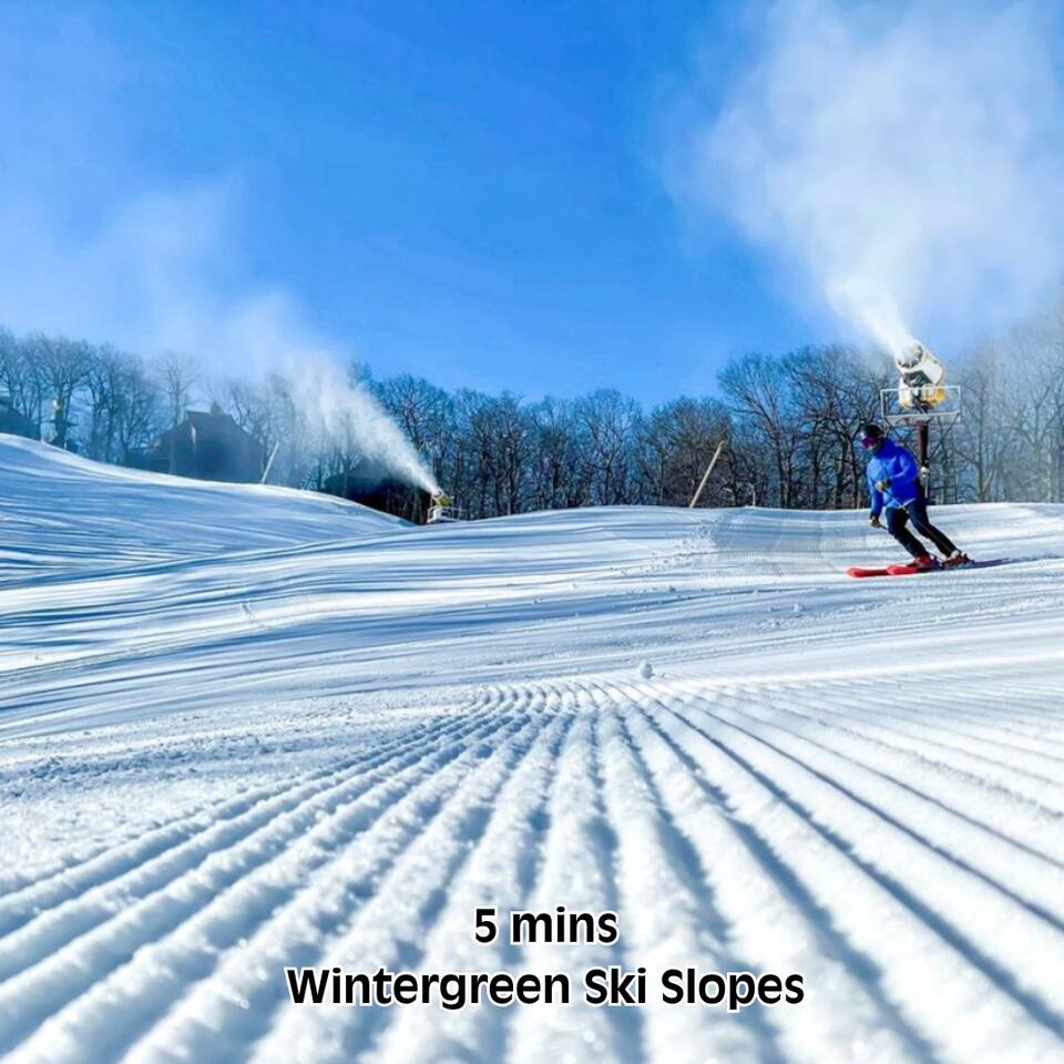 The house is a 5 minute drive to the slopes, dining, and all the other Wintergreen attractions. If you’re willing to venture a bit further, some of the best hiking trails in the state are off the Blue Ridge Parkway (15 minutes from the house), and there are over dozen wineries, breweries, and distilleries all within a 30 minute drive. During the summer, enjoy Sherando Lake and Lake Monocan with sandy beach entrances, or take a dip in the heated community pool. When you open the door to this beautiful home you’ll see every inch has been carefully and professionally decorated. The open floorplan starts with a welcoming & spacious entry way to set down your luggage and leads you into a decadent living area, beautiful stone fireplace w/ smart TV, and sky-high ceilings! "This place is amazing inside and out !!! Absolutely gorgeous, so tastefully decorated and felt so cozy !!! Everything we needed." - The Stoll Family The home layout is as follows: Main level: • Living room with wood burning fireplace (firewood provided) • Dining area with space for 8-10 at the main table, plus another 4 at the adjoining bar • Covered porch with large 12 person outdoor dining table and cozy swinging daybed • Newly renovated and fully stocked kitchen with a suite of stainless appliances and everything you need to prepare large meals (including spices) • Fully loaded Keurig coffee/tea bar and hot cocoa station • BR 1: Master bedroom with king bed, additional seating area, desk/work space, and back porch access • Full bath 1: Ensuite bathroom to BR 1 with shower/tub combo • BR 2: Additional master bedroom with king bed and reading chair • Full bath 2: Ensuite bathroom to BR2 with shower/tub combo • Half bath • Laundry area with full size washer and 2 dryers to dry the whole group's ski clothes in record time ;) Upstairs: • BR 3: Bunk room with two sets of twin-over-twin bunk beds, plus a climbing wall, Lego wall, and infinity game table with tons of built-in digital board games • BR 4: King bedroom • Full bath 3: Jack-and-Jill bathroom between BR3 and BR4, with shower/tub combo • BR 5: King bedroom • BR 6: King bedroom • Full bath 4: Jack-and-Jill bathroom between BR5 and BR6, with shower/tub combo Backyard: • Brand new 7 person hot tub with custom-built bar surrounding it, so you can be social even if you don't want to get in :) • Outdoor living & seating area under the gazebo with big screen outdoor TV • 6 burner stainless steel propane grill • Wood burning firepit surrounded by 10 Adirondack chairs. Firewood is provided • Play set with swings, slide, and climbing wall • Several yard games including corn hole, spike-ball, kan jam, ladder ball, etc