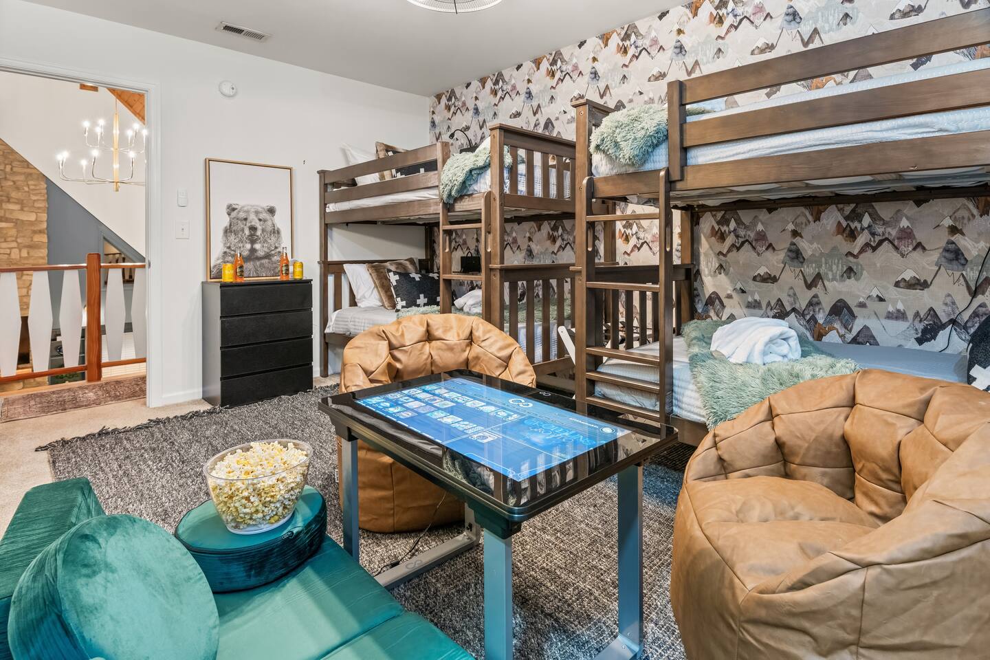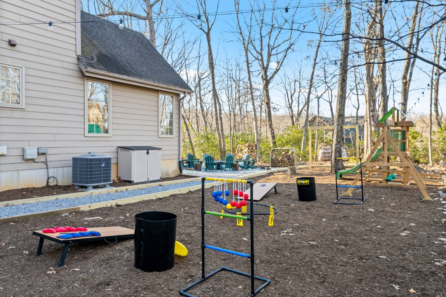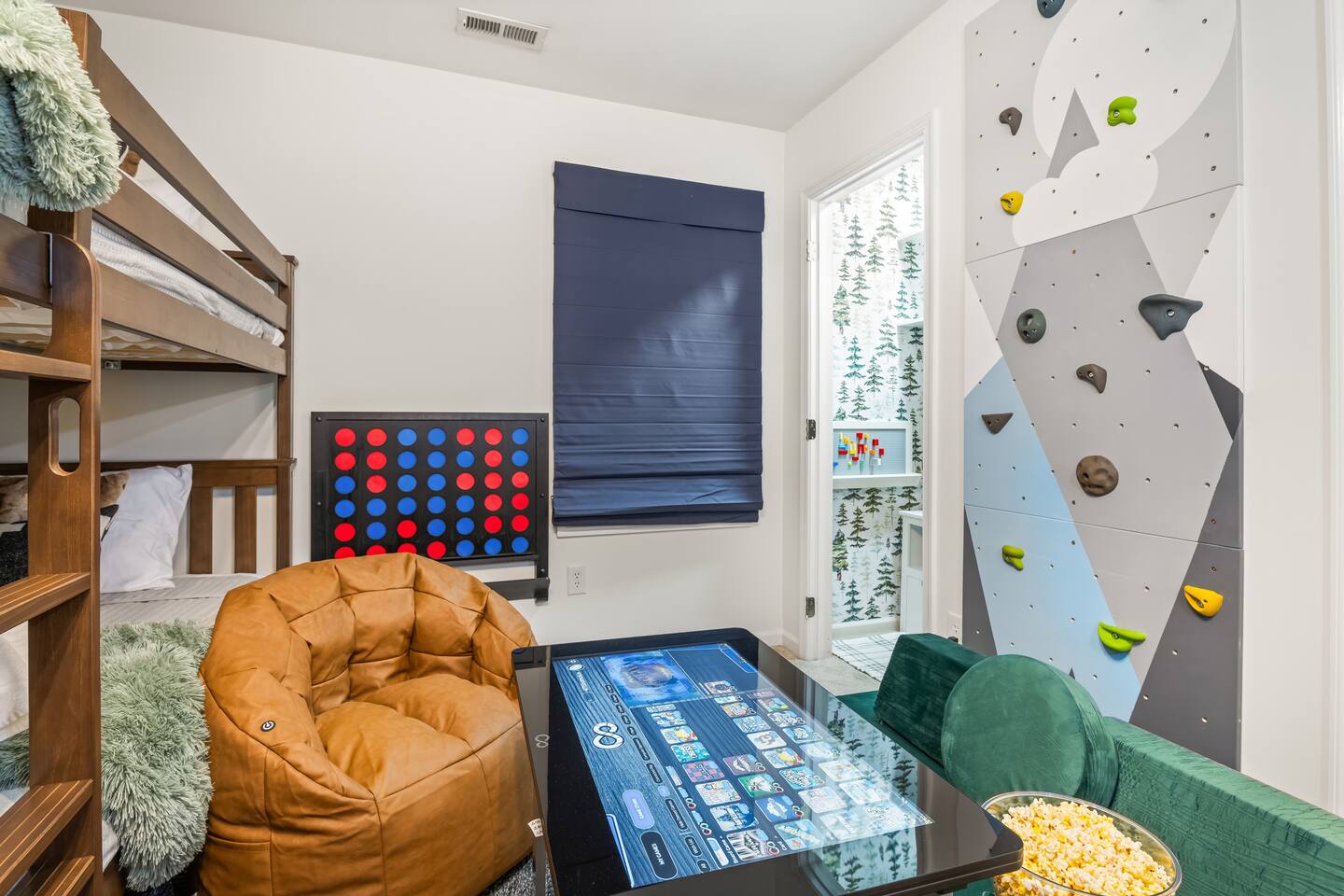 The house is a 5 minute drive to the slopes, dining, and all the other Wintergreen attractions. If you’re willing to venture a bit further, some of the best hiking trails in the state are off the Blue Ridge Parkway (15 minutes from the house), and there are over dozen wineries, breweries, and distilleries all within a 30 minute drive. During the summer, enjoy Sherando Lake and Lake Monocan with sandy beach entrances, or take a dip in the heated community pool. When you open the door to this beautiful home you’ll see every inch has been carefully and professionally decorated. The open floorplan starts with a welcoming & spacious entry way to set down your luggage and leads you into a decadent living area, beautiful stone fireplace w/ smart TV, and sky-high ceilings! "This place is amazing inside and out !!! Absolutely gorgeous, so tastefully decorated and felt so cozy !!! Everything we needed." - The Stoll Family The home layout is as follows: Main level: • Living room with wood burning fireplace (firewood provided) • Dining area with space for 8-10 at the main table, plus another 4 at the adjoining bar • Covered porch with large 12 person outdoor dining table and cozy swinging daybed • Newly renovated and fully stocked kitchen with a suite of stainless appliances and everything you need to prepare large meals (including spices) • Fully loaded Keurig coffee/tea bar and hot cocoa station • BR 1: Master bedroom with king bed, additional seating area, desk/work space, and back porch access • Full bath 1: Ensuite bathroom to BR 1 with shower/tub combo • BR 2: Additional master bedroom with king bed and reading chair • Full bath 2: Ensuite bathroom to BR2 with shower/tub combo • Half bath • Laundry area with full size washer and 2 dryers to dry the whole group's ski clothes in record time ;) Upstairs: • BR 3: Bunk room with two sets of twin-over-twin bunk beds, plus a climbing wall, Lego wall, and infinity game table with tons of built-in digital board games • BR 4: King bedroom • Full bath 3: Jack-and-Jill bathroom between BR3 and BR4, with shower/tub combo • BR 5: King bedroom • BR 6: King bedroom • Full bath 4: Jack-and-Jill bathroom between BR5 and BR6, with shower/tub combo Backyard: • Brand new 7 person hot tub with custom-built bar surrounding it, so you can be social even if you don't want to get in :) • Outdoor living & seating area under the gazebo with big screen outdoor TV • 6 burner stainless steel propane grill • Wood burning firepit surrounded by 10 Adirondack chairs. Firewood is provided • Play set with swings, slide, and climbing wall • Several yard games including corn hole, spike-ball, kan jam, ladder ball, etc